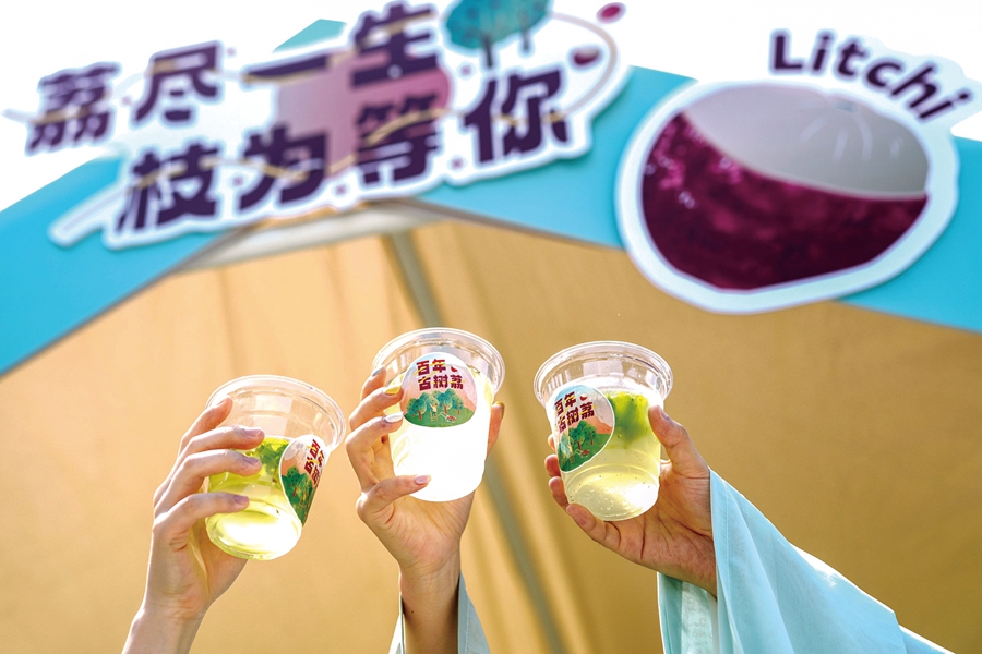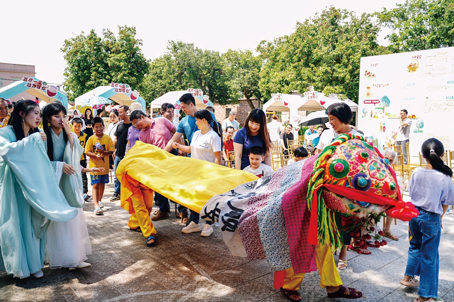 蘆洲鎮(zhèn)蘆村荔枝公園的百年古樹(shù)下人頭攢動(dòng),客家傳統(tǒng)麒麟舞伴隨著喧鬧的鑼鼓聲,歡快地在公園各處造勢(shì)舞動(dòng)。現(xiàn)場(chǎng)還有創(chuàng)意十足的荔枝花束和特色茶飲,為古樹(shù)荔枝賦予全新的活力。以荔枝為主元素的活動(dòng)吸引了一大批村民與游客駐足參與,獨(dú)具特色的八角方桌上擺放的蘆洲特色農(nóng)產(chǎn)品讓人目不暇接。