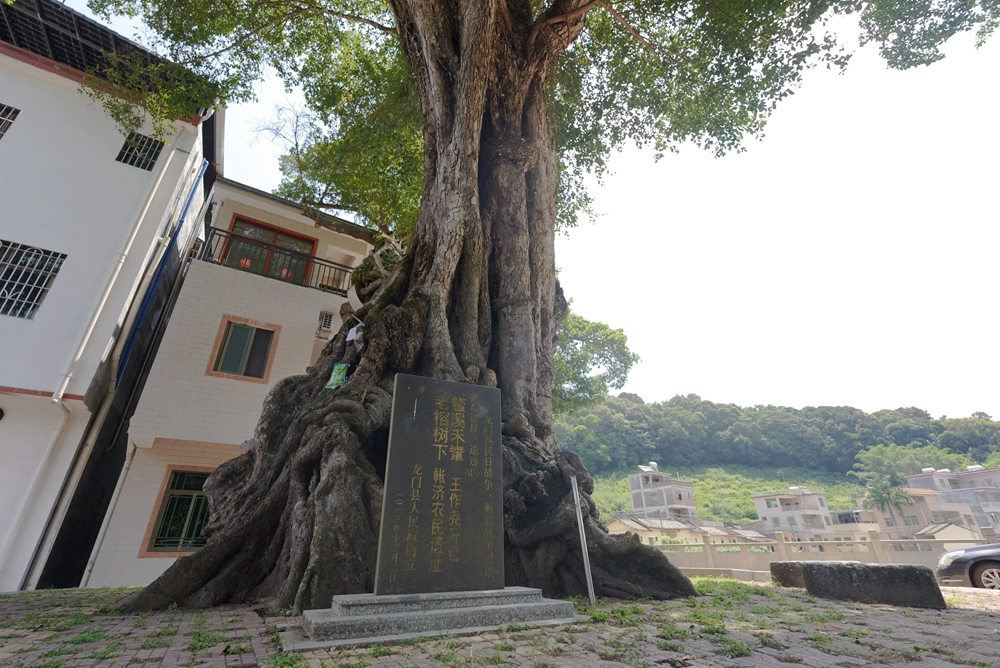 關(guān)于這棵榕樹,還有一個故事。故事被刻在樹下的一塊石碑上,上寫著“鰲溪禾輋,老榕樹下——王作堯開倉帳濟農(nóng)民遺址”,講的就是當(dāng)年東江縱隊副司令員王作堯率領(lǐng)部隊挺進麻榨鰲溪地區(qū),在老榕樹下攻破敵人糧倉,接濟農(nóng)民的歷史故事。