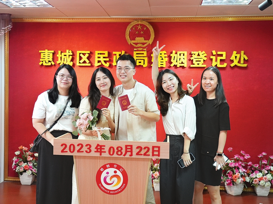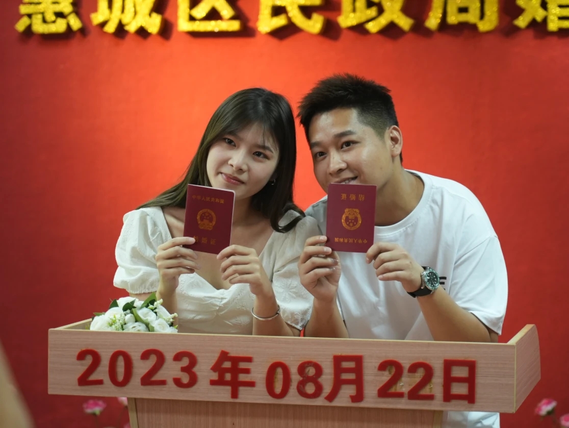 呂先生和劉小姐領(lǐng)到結(jié)婚證,曬出“小紅本”,開心地在鏡頭前做出心型的手勢。“我特意選了七夕這個美好的日子和女友前來領(lǐng)證。”新人呂先生和大家一起分享“甜蜜”。他和女友是研一時開始談戀愛的,研究生畢業(yè)后一起通過人才引進(jìn)的方式來到惠州工作安家,“我們都是北方人,在這里相互依靠建起小家。”劉小姐滿眼幸福地告訴記者,她和呂先生經(jīng)過六七年的戀愛,共同經(jīng)歷了人生中的求學(xué)奮斗時光,最讓她感動的是疫情期間的一次經(jīng)歷,“他當(dāng)時身體很不舒服,我發(fā)熱了,他還半夜里背著我去醫(yī)院,他是一個很有責(zé)任感的人。”