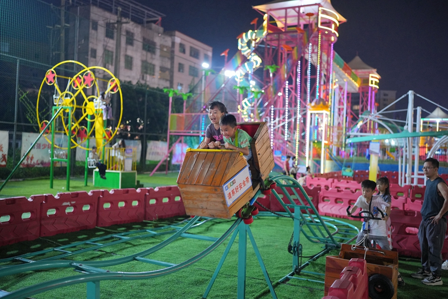 孩子在無(wú)動(dòng)力樂(lè)園享受夜晚游園的樂(lè)趣。