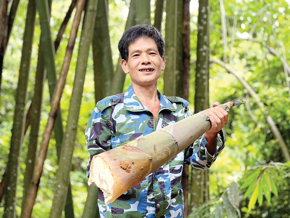 日前,記者跟隨村里的老農(nóng)人黃治忠走進(jìn)一處深山竹林,蟲鳴鳥叫與徐徐清風(fēng)中,黃治忠爬上山坡,在一處竹枝繁茂處躬身查看。黃治忠用砍竹刀輕輕撥動(dòng)竹筍周圍的泥土,然后用力插到泥土深處,不一會(huì)兒,一根鮮嫩的竹筍就被挖了出來(lái)。嫻熟的挖筍技術(shù),足以佐證老農(nóng)人與竹筍的“交情”之深。