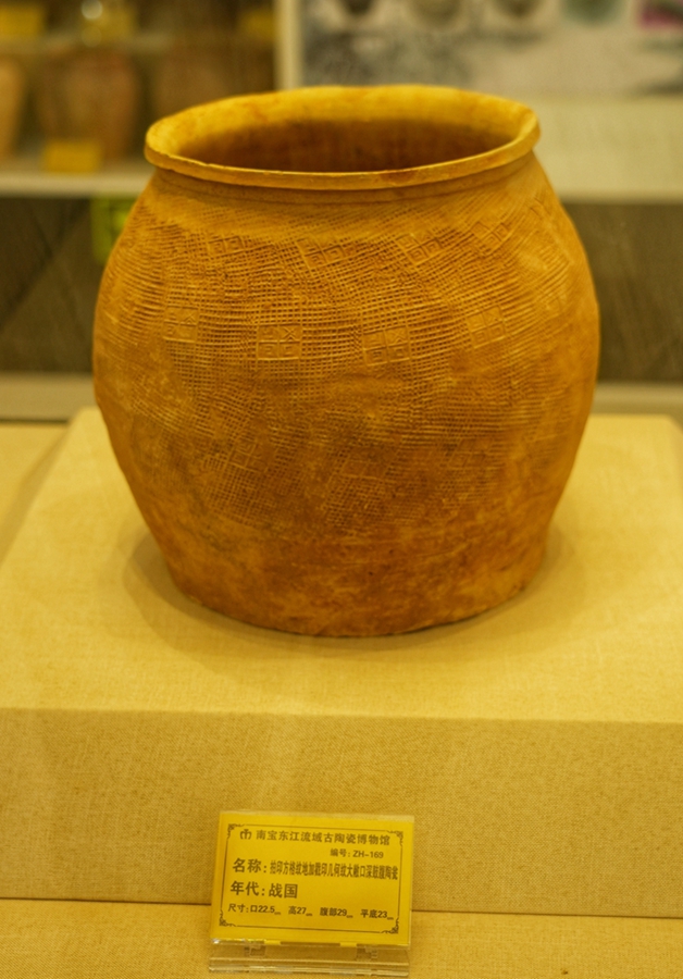 該博物館展示的一件西漢陶甕,淺黃色,高0.32米,口徑0.235米,器型碩大,保存完好,表面原本施有原始青釉,現(xiàn)表面仍依稀可見部分青釉,胎體堅硬,器表通體印方格紋地加戳幾何紋,平底,也是東江流域典型器型。
