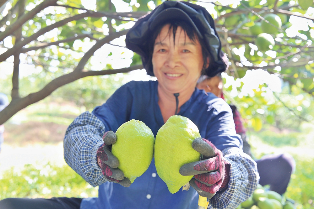 當(dāng)?shù)卮迕駰畎⒁淌遣烧?duì)伍中的一員,只見她熟練地?fù)荛_綠葉,右手拿起剪刀,在一片清脆的“咔嚓”聲中,一下就裝了滿滿一筐果子。“看,今年這些檸檬又大又靚,招人喜歡。”楊阿姨說(shuō),她八月初就來(lái)種植園采摘了,一天下來(lái)有150元收入。說(shuō)話間,又有幾個(gè)果子落入她手中。