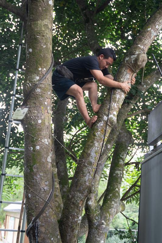 日前,剛走進(jìn)古欖園,記者便聽到陣陣打?yàn)鯔炻暋9艡靾@里有208棵古欖樹,大部分為烏欖,每棵欖樹的樹齡都超過了100年,枝繁葉茂,樹高接近或者超過10米,烏欖就結(jié)在高高的樹上。因此,打?yàn)鯔觳⒉皇且患资拢枰罉洹?