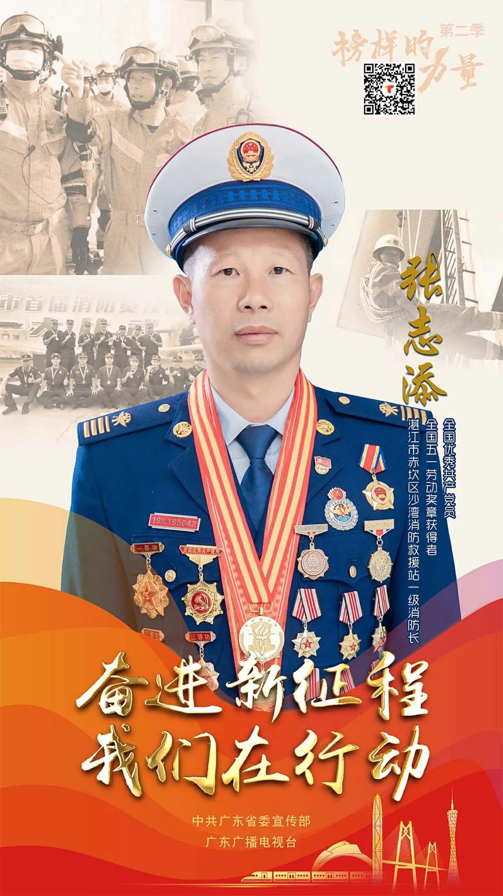 張志添,現(xiàn)任湛江市赤坎區(qū)沙灣消防救援站一級消防長,全國優(yōu)秀共產(chǎn)黨員,被譽為消防救援隊伍的“兵王”。25年來,先后參加4000余次急難險重任務(wù)處置,疏散搶救群眾1000余人。特別是2015年18級超強臺風(fēng)襲擊湛江,霞山區(qū)富多煤氣公司3個儲罐970余噸液化石油氣大面積泄漏,他在強臺風(fēng)中登罐堵漏,殊死搏斗40余小時,成功化解了災(zāi)難,以行動彰顯了一名共產(chǎn)黨員向死而生、逆火而行的使命擔當。2021年7月、11月,先后兩次在北京人民大會堂被習(xí)近平總書記接見。