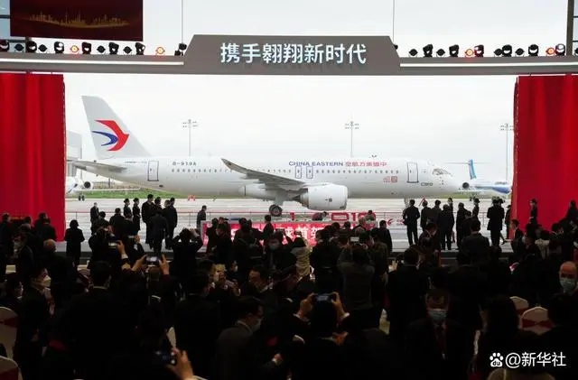 這是國產(chǎn)大飛機(jī)C919交付全球首家用戶東航的儀式現(xiàn)場(chǎng)(2022年12月9日攝)。新華社記者 丁汀 攝