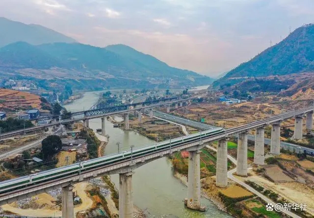 一列復(fù)興號(hào)動(dòng)車組在四川省冕寧縣境內(nèi)的新成昆鐵路進(jìn)行開通運(yùn)營前的試跑,遠(yuǎn)處是老成昆鐵路(無人機(jī)照片,2022年12月24日攝)。新華社記者 王曦 攝