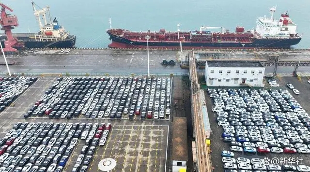 在江蘇連云港港口碼頭,一批國產(chǎn)小汽車在等待裝船出口海外(無人機(jī)照片,1月13日攝)。新華社發(fā)(耿玉和 攝)