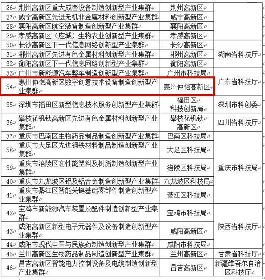 日前,科技部火炬中心公布新一批創(chuàng)新型產(chǎn)業(yè)集群名單,全國共46家創(chuàng)新型產(chǎn)業(yè)集群榜上有名。其中,惠州仲愷高新區(qū)數(shù)字創(chuàng)意技術(shù)設(shè)備制造創(chuàng)新型產(chǎn)業(yè)集群入選,成為全市唯一一家上榜的產(chǎn)業(yè)集群。