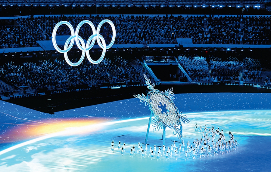 雷曼光電生產(chǎn)的“冰雪五環(huán)”亮相2022年北京冬奧會。