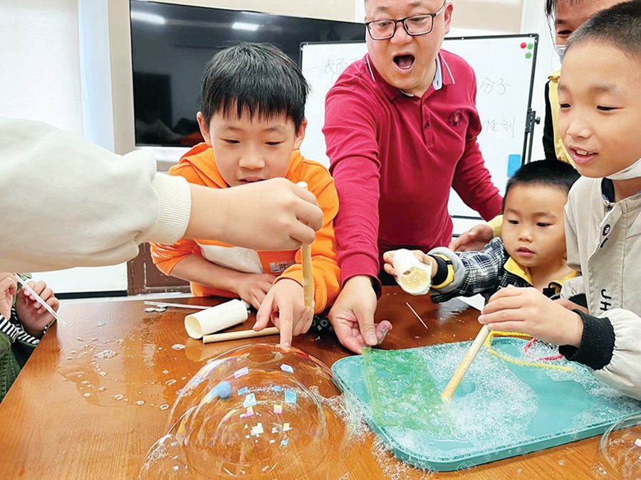 活動最后是小朋友的專場——由仲愷中學(xué)物理高級教師徐建平為小朋友們上《神奇的泡泡》科普課。回形針可以浮在水面上,吹出的泡泡可以當球拍,泡泡可以一個一個套在一起……徐老師通過一個個神奇的游戲,讓孩子們直觀地認識了水面張力。孩子們也躍躍欲試,紛紛走上前,挑戰(zhàn)套泡泡,最后,一個初二的小女孩成功套了三層泡泡。“物理學(xué)習(xí)不能靠死記硬背公式,一定要結(jié)合生活去理解、去領(lǐng)悟,才能真正學(xué)懂弄通,讓孩子保持學(xué)習(xí)的熱情。”徐老師說。