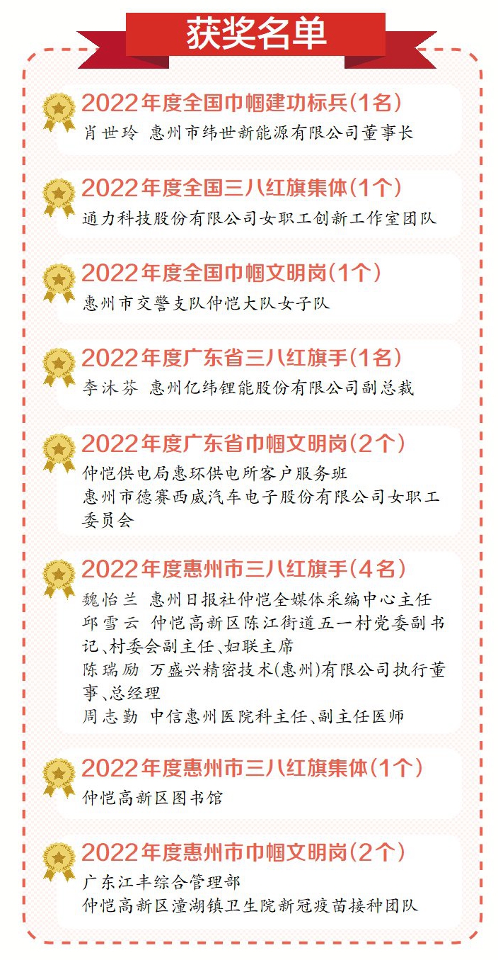 仲愷高新區(qū)婦聯(lián)主席吳歡歡介紹,在2022年度,該區(qū)巾幗奮發(fā)向上、銳意進(jìn)取,在各條戰(zhàn)線綻放芳華,除通力科技股份有限公司女職工創(chuàng)新工作室團(tuán)隊榮獲全國三八紅旗集體稱號外,惠州市交警支隊仲愷大隊女子隊榮獲全國巾幗文明崗稱號,惠州市緯世新能源有限公司董事長肖世玲榮獲全國巾幗建功標(biāo)兵稱號;1人榮獲省三八紅旗手稱號,2個單位榮獲省巾幗文明崗稱號;4人榮獲市三八紅旗手稱號,1個單位榮獲市三八紅旗集體稱號,2個單位榮獲市巾幗文明崗稱號;25人榮獲區(qū)三八紅旗手稱號,7個單位榮獲區(qū)三八紅旗集體稱號,10個單位榮獲區(qū)巾幗文明崗稱號。