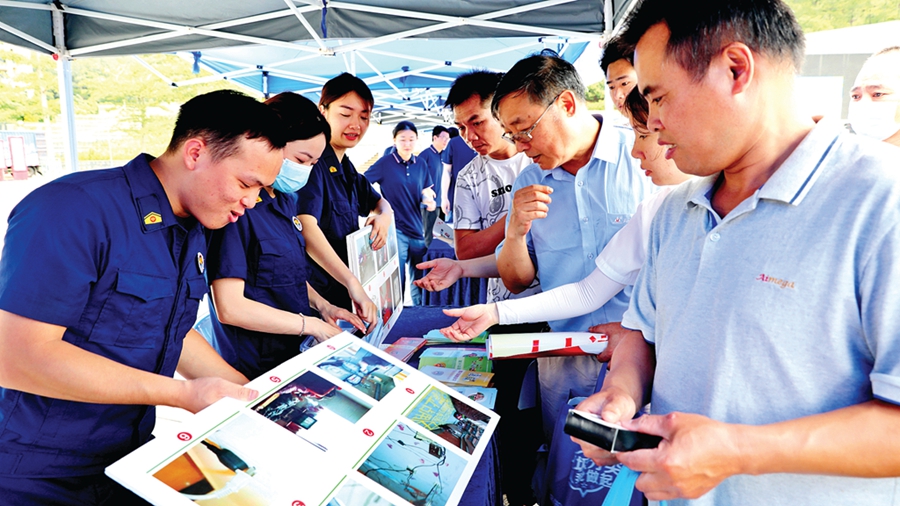 工作人員向企業(yè)員工和群眾科普安全生產(chǎn)知識(shí)。惠州日?qǐng)?bào)記者邱舒婷 通訊員劉銘 攝