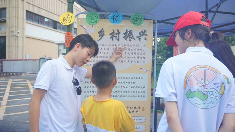 除了科普宣傳,“宣傳一條街”還布置了問答屋攤位,以問促學(xué),讓居民更加深刻地了解鄉(xiāng)村振興的重大意義。“鄉(xiāng)村振興是為了解決什么問題提出的呢?”在聽完隊員們的講解后,大部分居民們都能很快回答出來。“你們大學(xué)生都是好樣的!”聽完科普宣講后的阿姨笑著對隊員們豎起了大拇指。