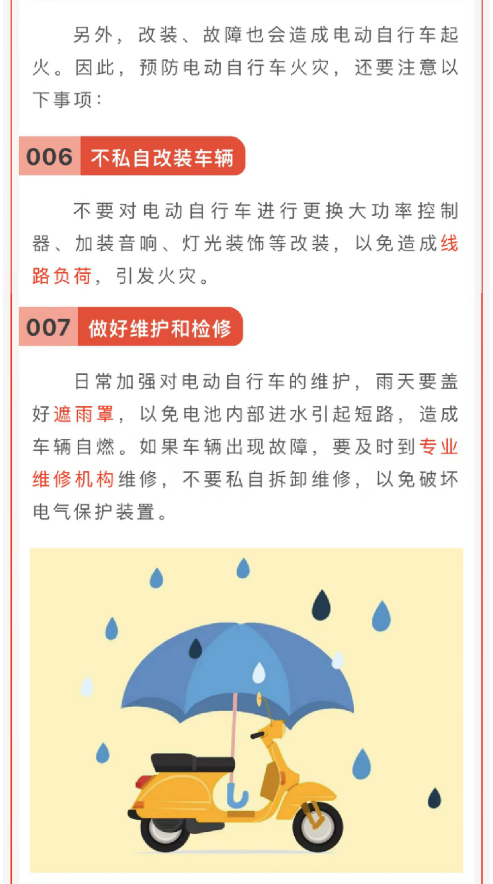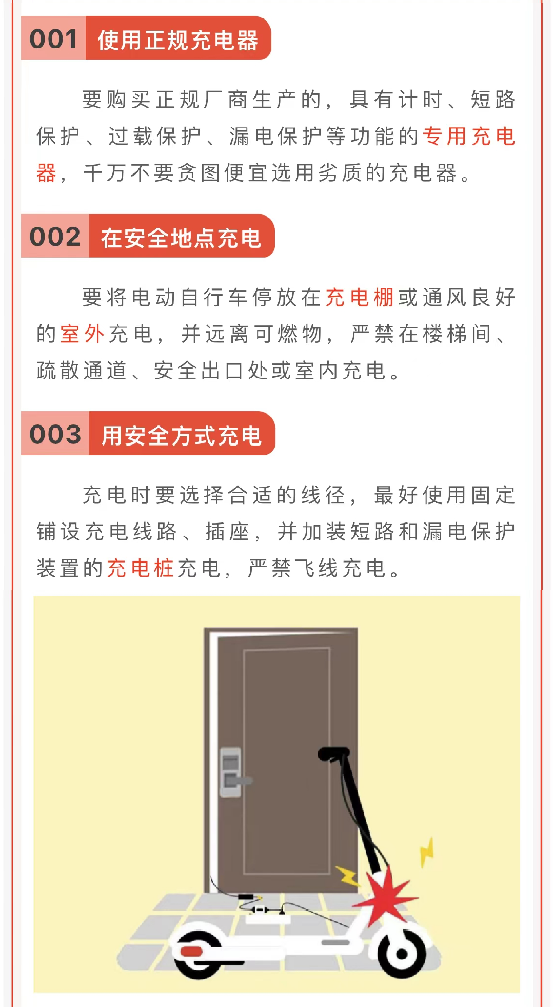 避免電動(dòng)車火災(zāi),要做到:購(gòu)買正規(guī)廠家生產(chǎn)的合格產(chǎn)品,電池定期保養(yǎng),不擅自改裝等等,更多注意事項(xiàng),請(qǐng)務(wù)必查看下圖。