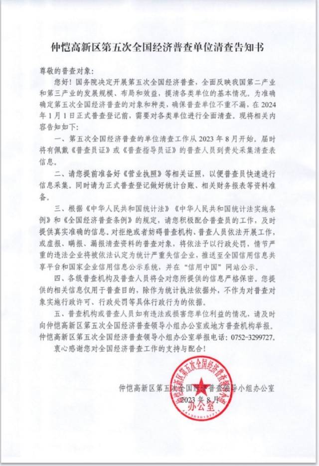 8月18日,仲愷高新區(qū)第五次全國經(jīng)濟(jì)普查領(lǐng)導(dǎo)小組辦公室發(fā)布公告,提醒轄區(qū)群眾警惕以經(jīng)濟(jì)普查為由的詐騙。