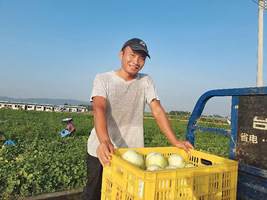 李院樂和村民一起采收白香瓜。