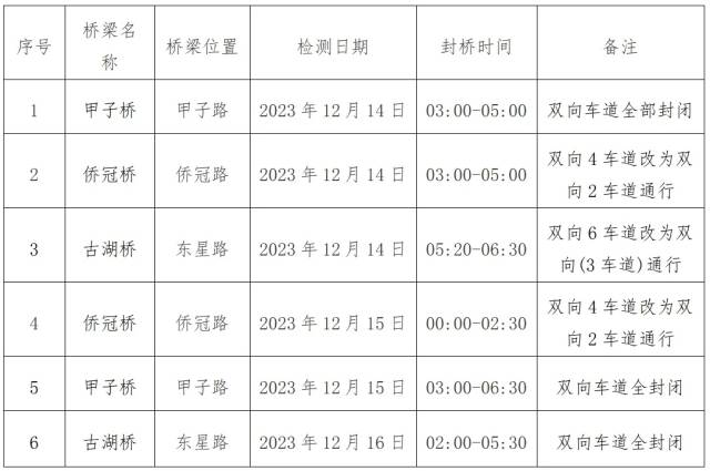 公告提醒,封橋檢測期間橋梁禁止車輛和行人通過,請市民朋友提前規(guī)劃選擇合適的路線出行,由此造成的出行不便,敬請諒解。
