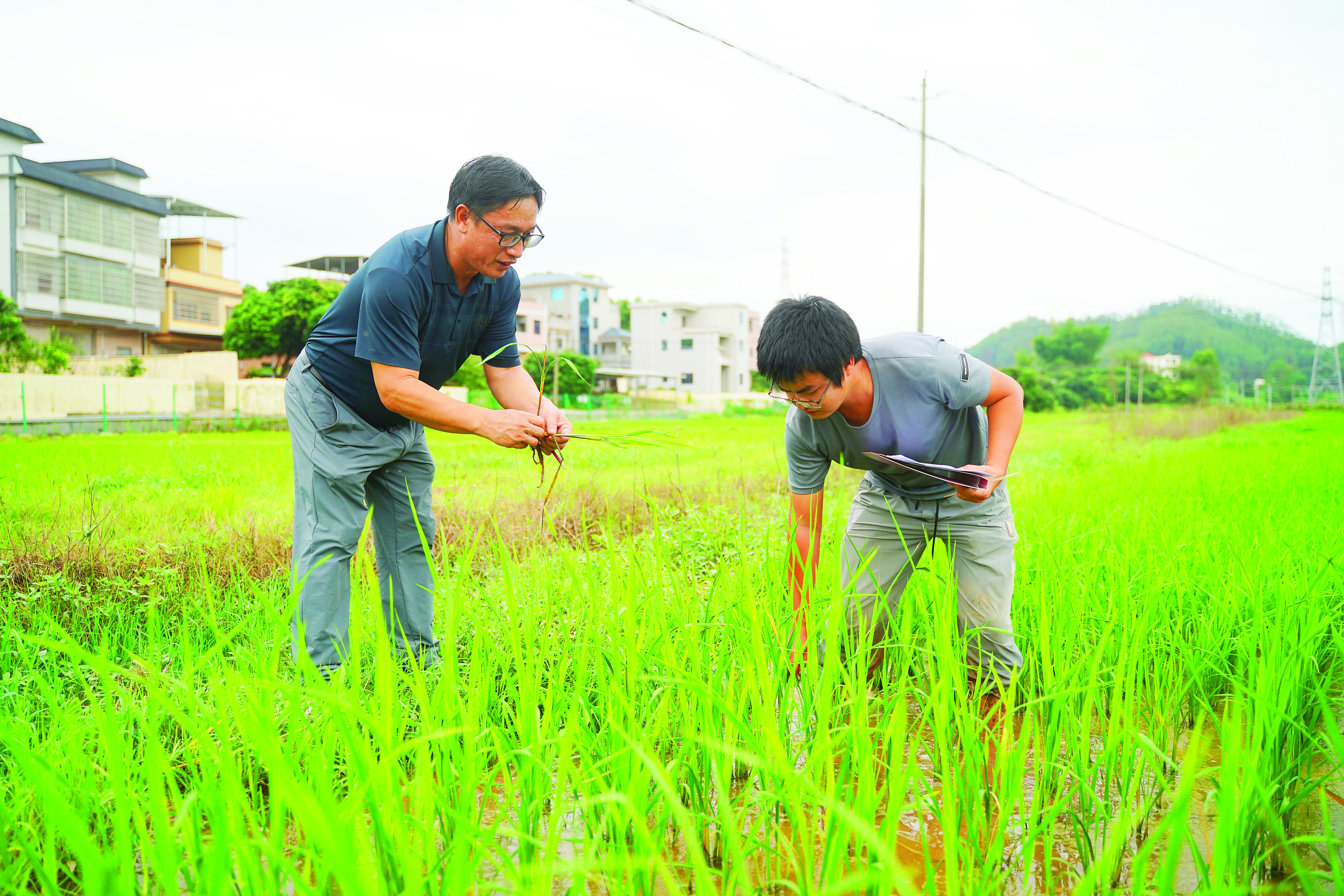 福豐種業(yè)負(fù)責(zé)人劉冠明(左)查看水稻生長情況。 惠州日?qǐng)?bào)記者湯渝杭 攝