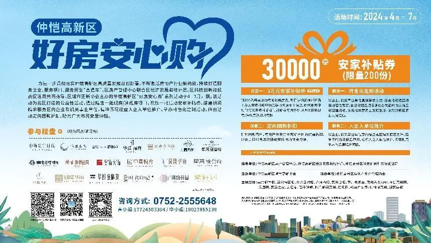 同時,為滿足廣大市民剛性及改善性住房需求,減輕購房壓力,仲愷高新區(qū)“好房安心購”系列活動嚴(yán)格執(zhí)行相關(guān)優(yōu)惠政策。“3萬元購房補貼券”正在持續(xù)發(fā)放,團購優(yōu)惠折扣也在有序洽談,19個“五證”齊全的現(xiàn)房(準(zhǔn)現(xiàn)房)樓盤項目均以最大的誠意,盡最大的努力,為廣大市民在仲愷安居送出最多的福利,提供最優(yōu)的便利。此外,“好房安心購”的活動優(yōu)惠還可疊加使用惠州市發(fā)放的“1億元樓市消費券”,補貼升級,更享實惠。