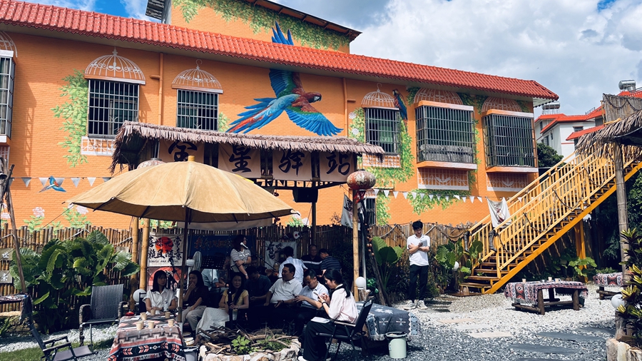 走進(jìn)金星驛站,一只展翅高飛的藍(lán)色大鳥墻繪分外引人注目,窗戶則裝飾成鳥籠,別具一格。環(huán)看四周,籬笆作墻,綠植高低錯(cuò)落,院子中“小溪”流水潺潺,溪旁有一座小亭獨(dú)立,讓人不禁生出“坐看云卷云舒”的閑適之情。據(jù)金星驛站主人溫嘉玲介紹,她回家探親時(shí)發(fā)現(xiàn)村里環(huán)境優(yōu)美、交通便利,于是仔細(xì)拾掇爺爺留下的廢舊小院,打造了這方“美麗庭院”,沒想到一下子成為網(wǎng)紅打卡點(diǎn)。