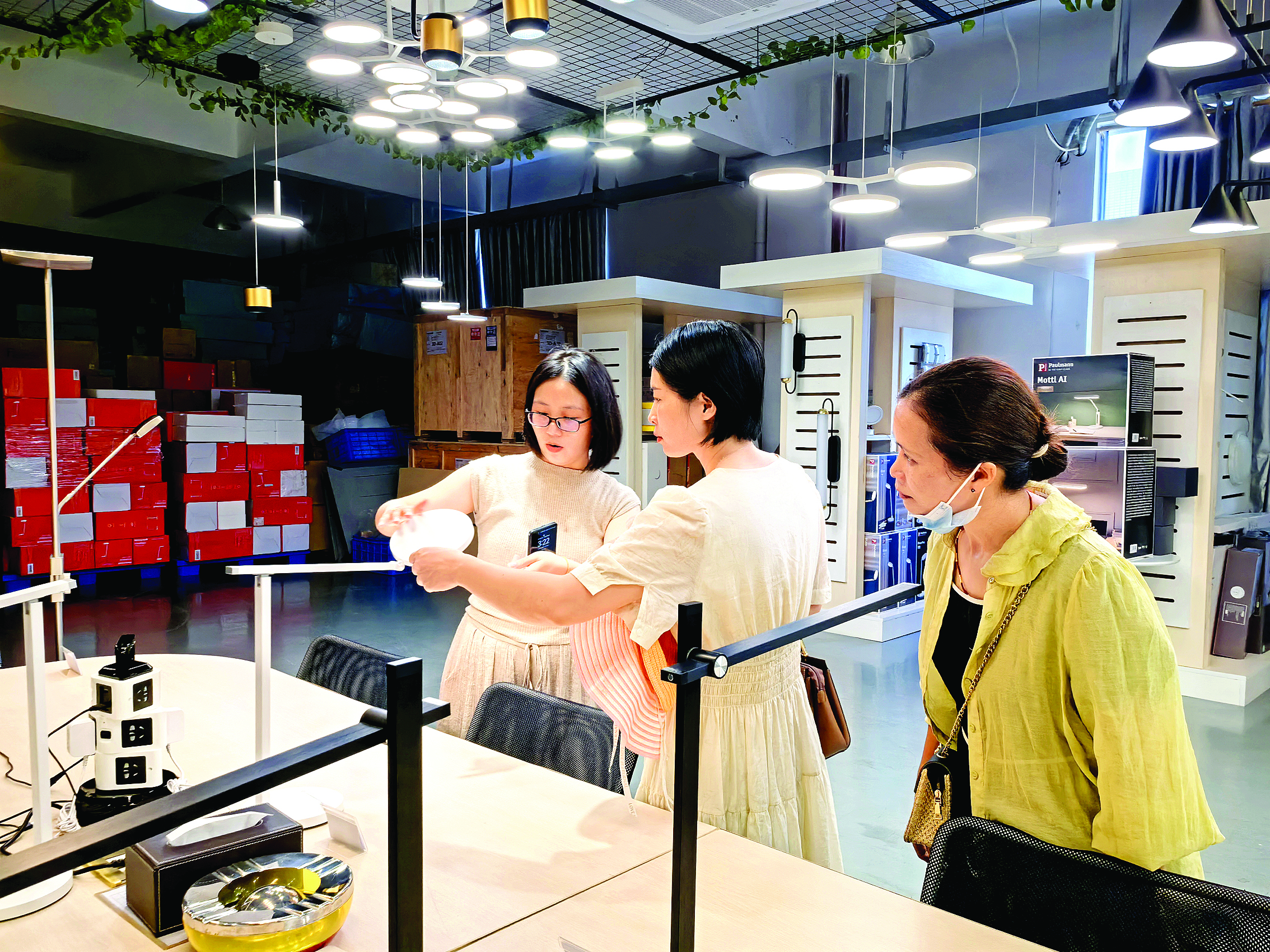 市民走進“沃生照明”了解各種照明產(chǎn)品。 惠州日報記者邱舒婷 通訊員葉慧霓 攝