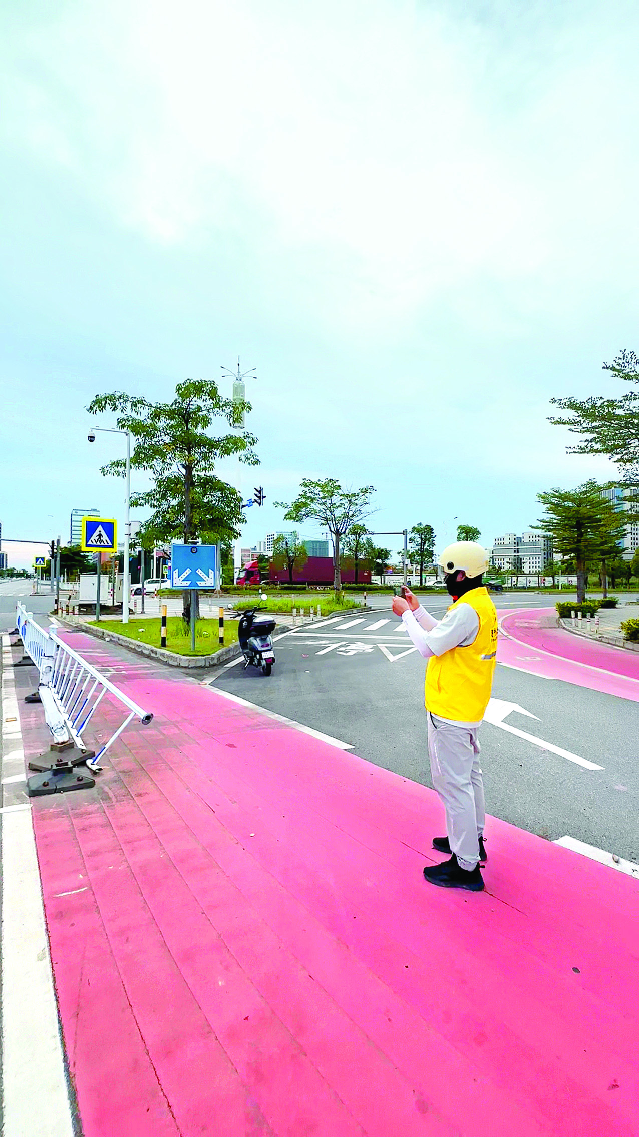 邱劍念在送外賣過程中,發(fā)現(xiàn)路上一處護欄壞了,停下來拍照記錄。惠州日報記者湯渝杭 攝
