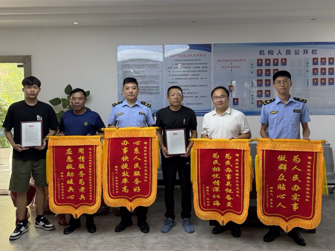 “他們救了我,我必須要找到他們!”近日,市民李先生幾經(jīng)輾轉(zhuǎn),來到仲愷高新區(qū)惠環(huán)街道綜合行政執(zhí)法隊,向救助他的執(zhí)法隊員,送上了錦旗和感謝信。原來,在臺風(fēng)“韋帕”肆虐之際,李先生駕駛電動車外出發(fā)生碰撞,當(dāng)場頭破血流。幸得巡邏的執(zhí)法隊員及時發(fā)現(xiàn)并伸出援手,最終化險為夷。