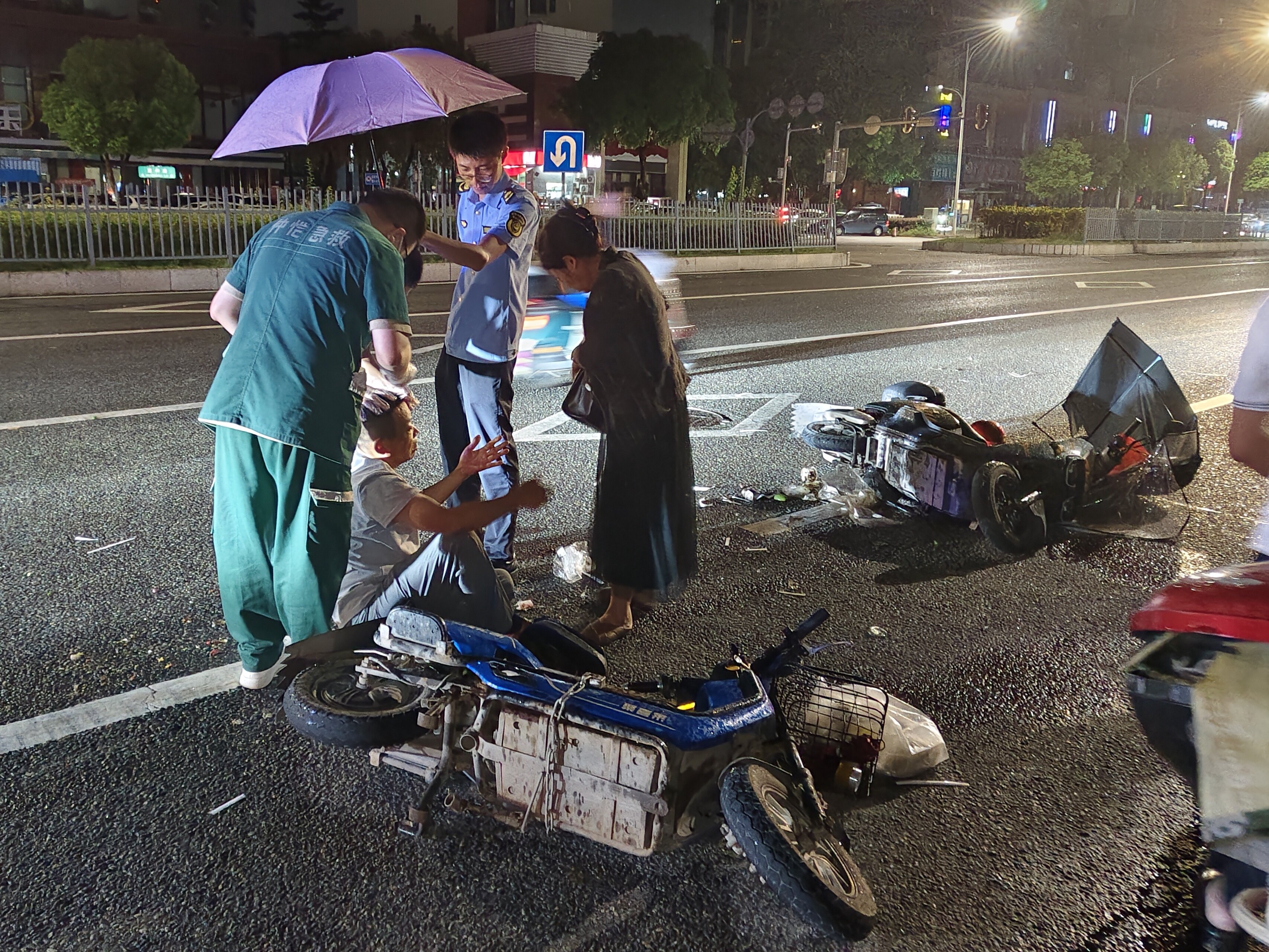 記者了解到,事發(fā)時是凌晨時分,臺風(fēng)“韋帕”帶來大風(fēng)大雨。當(dāng)時,惠環(huán)街道綜合行政執(zhí)法隊的隊員們在轄區(qū)內(nèi)冒雨巡查,排查安全隱患。巡邏至和暢五路路段時,隊員們發(fā)現(xiàn)兩輛電動車倒在路面上,還遠(yuǎn)遠(yuǎn)傳來哭聲。他們立即上前查看,發(fā)現(xiàn)一名年輕女子受了傷正在哭泣。而李先生也被摔得頭破血流,他的妻子被這一場面嚇到,只是無助痛哭。了解現(xiàn)場情況后,隊員們迅速撥打了120急救電話。在等待救護(hù)車的過程中,他們一邊維持現(xiàn)場秩序,疏導(dǎo)過往車輛,一邊安撫傷者及其家屬。由于擔(dān)心傷者淋雨加重傷勢,他們還紛紛撐傘為李先生遮擋傷口,任憑雨水打濕制服,成為了風(fēng)雨中最可靠的屏障。當(dāng)救護(hù)車抵達(dá),隊員們又合力將傷者抬上擔(dān)架,詳細(xì)向醫(yī)護(hù)人員說明情況,直到救護(hù)車消失在雨幕中,才默默整理好濕透的制服繼續(xù)巡邏。