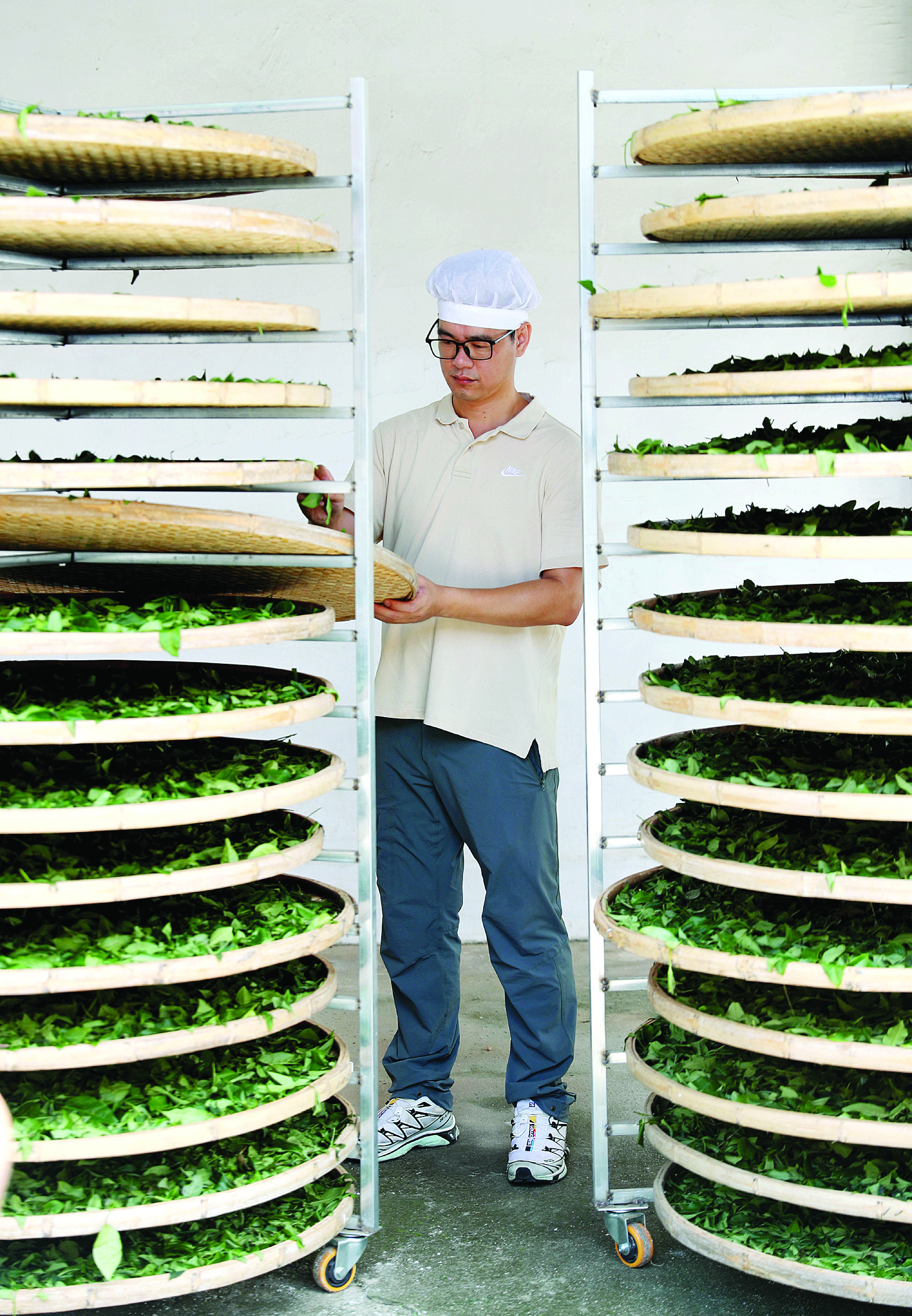 檢查茶葉的烘烤情況。