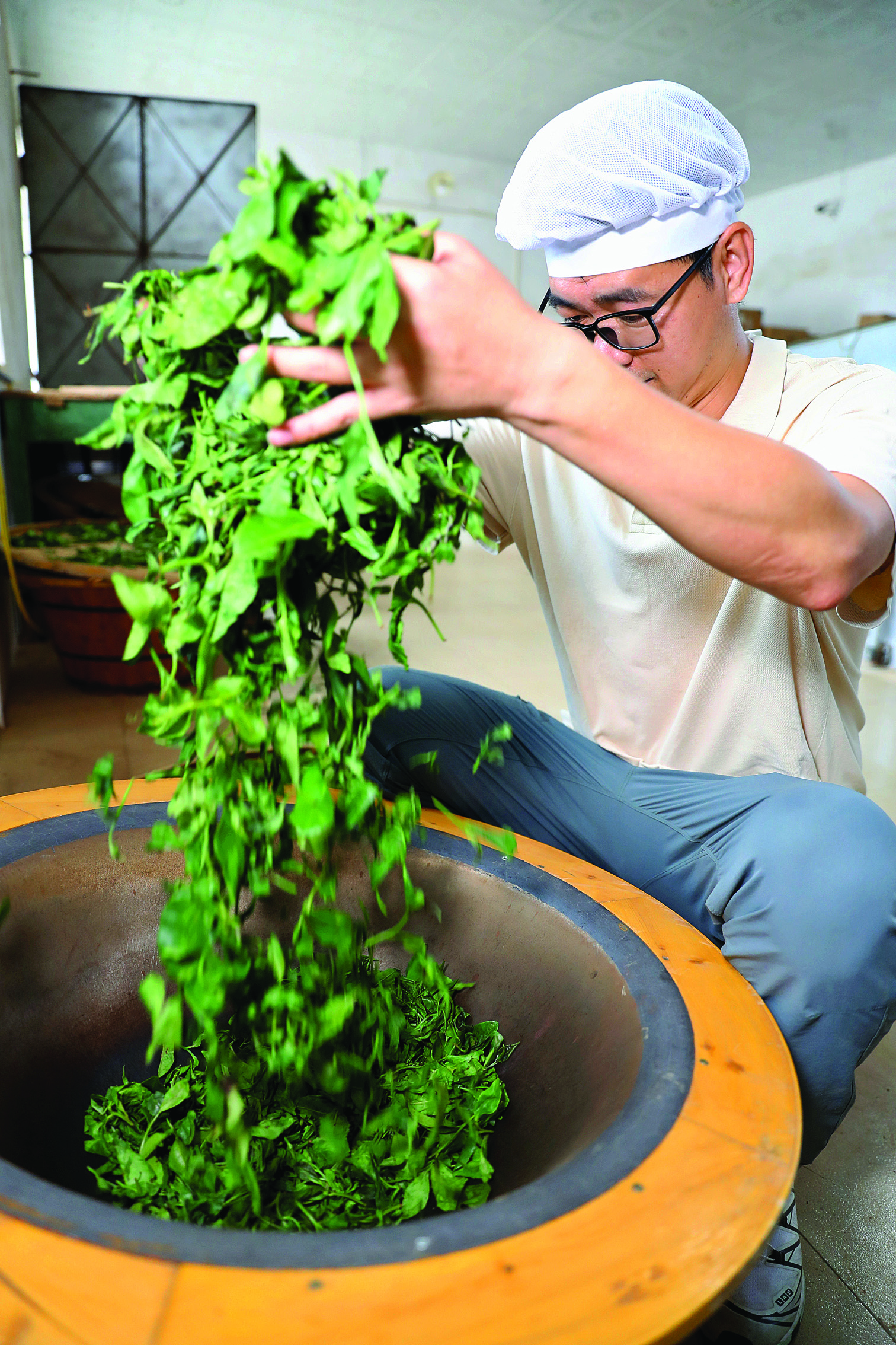 滾燙的殺青鍋熱氣蒸騰,一捧鮮嫩的茶青傾入,“滋啦”聲驟響,濃郁青草氣瞬間升騰彌漫……在仲愷高新區(qū)潼僑鎮(zhèn)的老茶廠內(nèi),負(fù)責(zé)人吳遠(yuǎn)波雙臂在近280攝氏度高溫的鐵鍋中翻飛,用手掌精準(zhǔn)感知著火候的微妙變化。鮮葉在他手中抖撒、翻動(dòng),青澀氣漸褪。吳遠(yuǎn)波專(zhuān)注的神情,無(wú)聲述說(shuō)著對(duì)傳統(tǒng)制茶技藝的堅(jiān)守。