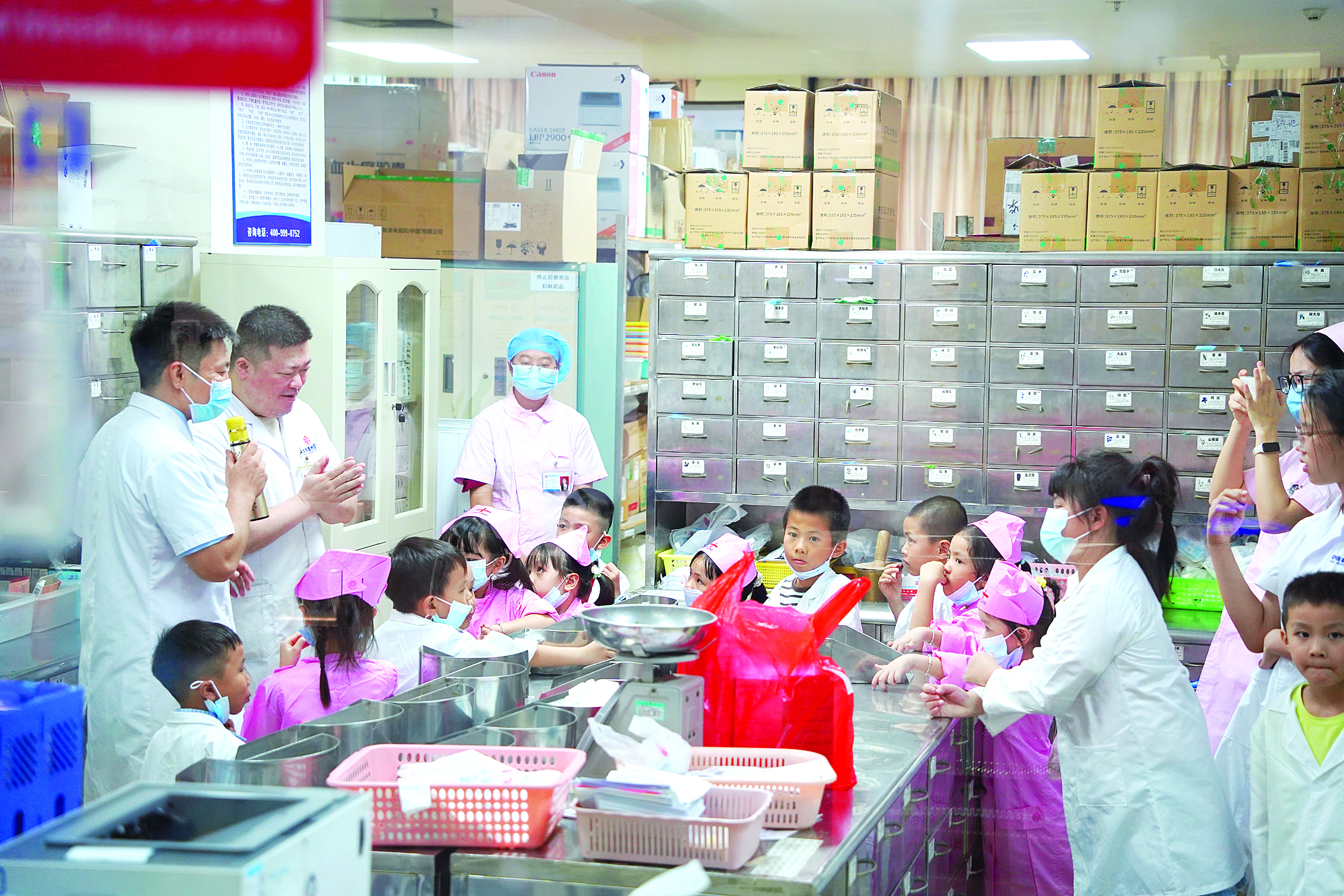 研學(xué)最后一站落腳中信惠州醫(yī)院,“職業(yè)體驗(yàn)”成為活動(dòng)的最大亮點(diǎn)。小朋友們換上白大褂,化身“小醫(yī)生”“小護(hù)士”,學(xué)習(xí)傷口清潔、包扎技巧,還在中藥房學(xué)習(xí)辨識(shí)常見(jiàn)中藥材。“以前怕去醫(yī)院,現(xiàn)在知道了醫(yī)生叔叔護(hù)士阿姨的工作有多重要。”沉浸式體驗(yàn)讓健康意識(shí)與醫(yī)學(xué)認(rèn)知深深扎根在孩子們心中。