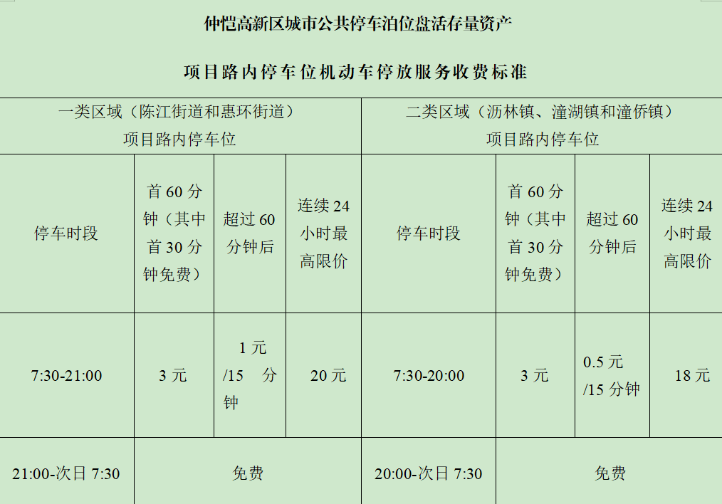 根據(jù)《關(guān)于仲愷高新區(qū)城市公共停車泊位盤活存量資產(chǎn)項(xiàng)目路內(nèi)停車位機(jī)動車停放服務(wù)收費(fèi)有關(guān)事項(xiàng)的批復(fù)》(惠仲經(jīng)統(tǒng)價〔2025〕14號)文件,收費(fèi)標(biāo)準(zhǔn)為: