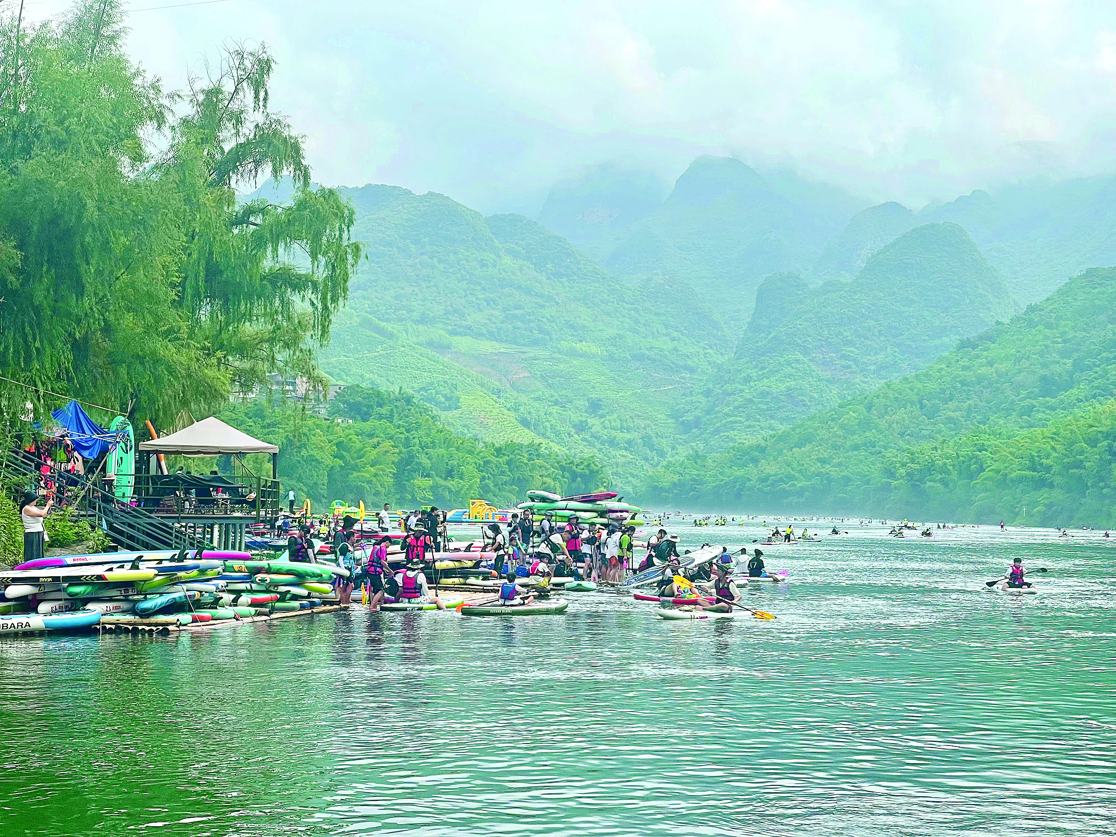 “加油!加油!加油……”去年夏天,2024年中國(guó)百城槳板公開(kāi)賽(安龍站)在此開(kāi)賽,來(lái)自廣東、上海等地的120余名槳板選手在南盤(pán)江上競(jìng)技,吸引游客關(guān)注,“壩爾代夫”的美名隨賽事傳遍網(wǎng)絡(luò)。自公開(kāi)賽在壩盤(pán)村舉辦后,這里便成為了槳板愛(ài)好者的樂(lè)園。游客量平日有約3000人,周末高峰時(shí)段高達(dá)4000余人,勞動(dòng)節(jié)、國(guó)慶節(jié)假期每天多達(dá)1.7萬(wàn)人。“國(guó)慶假期,僅槳板運(yùn)動(dòng)項(xiàng)目就給村集體經(jīng)濟(jì)增加12萬(wàn)元收入。”萬(wàn)峰湖鎮(zhèn)壩盤(pán)村黨支部書(shū)記、村委會(huì)主任陳啟仁說(shuō)。