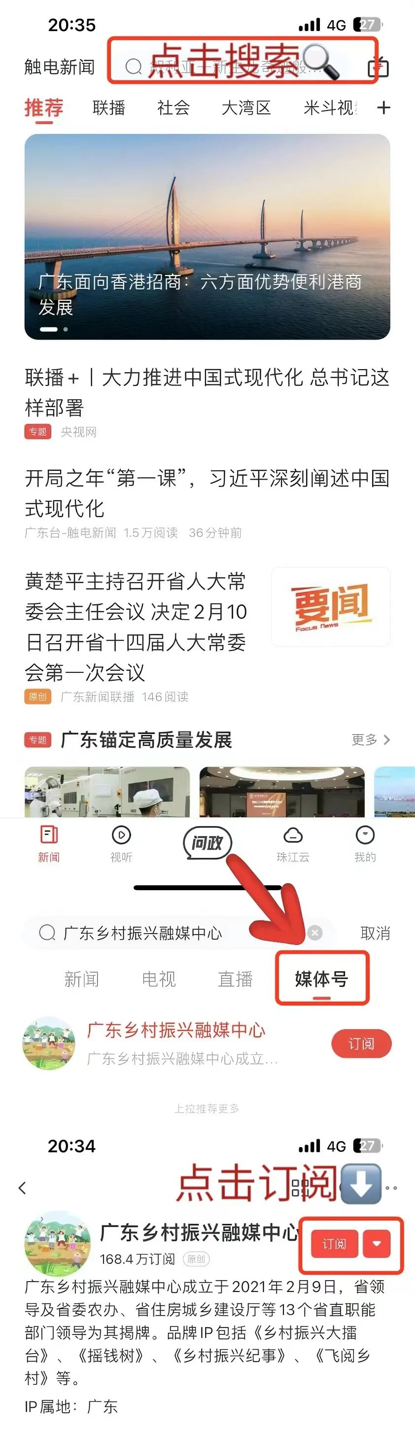 ①在“觸電新聞”APP里搜索?并訂閱【廣東鄉(xiāng)村振興融媒中心】觸電號