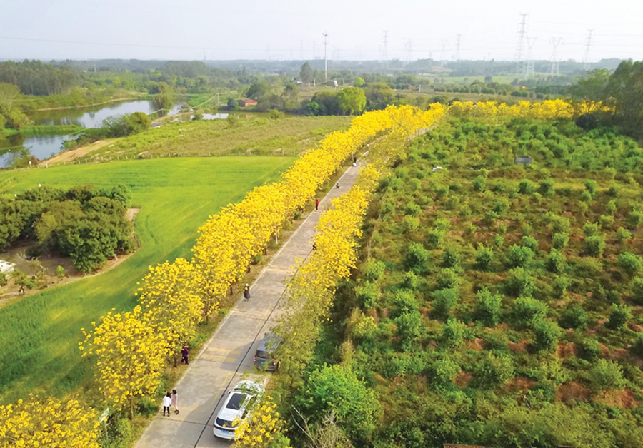 一路黃花,一路春意。書寫這般春天詩情畫意的,出自她的“巧手”——黃花風(fēng)鈴木。這蜿蜒10公里的黃花風(fēng)鈴木、超過5000棵,是博羅縣楊僑鎮(zhèn)2015年以來沿著村道兩旁種下的。如今,已成為當(dāng)?shù)剜l(xiāng)村振興的靚麗底色,也是綠美楊僑的最美風(fēng)景。