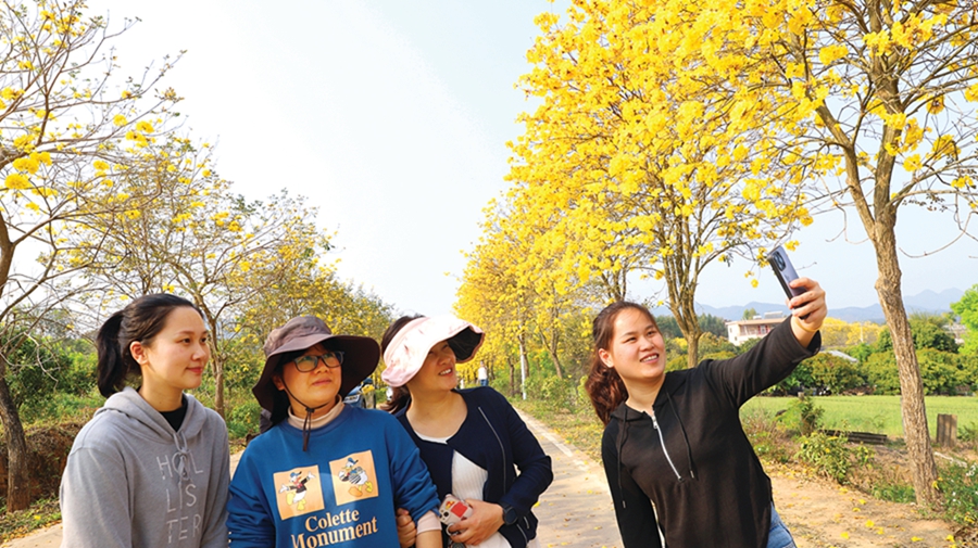 黃花風(fēng)鈴木成為楊僑特色景觀,吸引眾多游客前來觀賞留影。