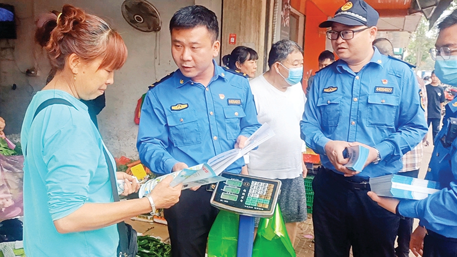 執(zhí)法人員給商戶派發(fā)宣傳資料。惠州日?qǐng)?bào)記者侯婉怡 攝