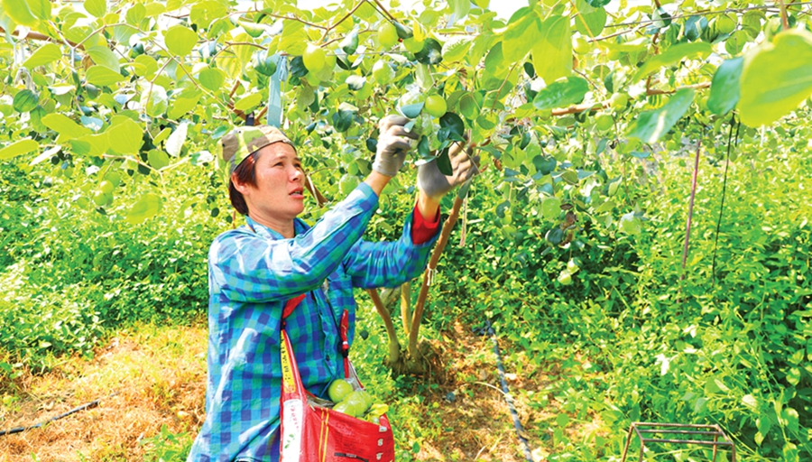 在崗南村的青棗種植園內(nèi)同樣一片綠意盎然。青棗的清香處處彌漫,一個個雞蛋大小的青棗綴滿枝頭。果園負責(zé)人駱令與工人們正穿行其間,采摘成熟青棗。駱令說:“4年前,我在崗南村租了24畝土地種植青棗。這里出產(chǎn)的青棗個大、味甜。”青棗種植園落戶以來,為村民們增加了一條增收渠道。