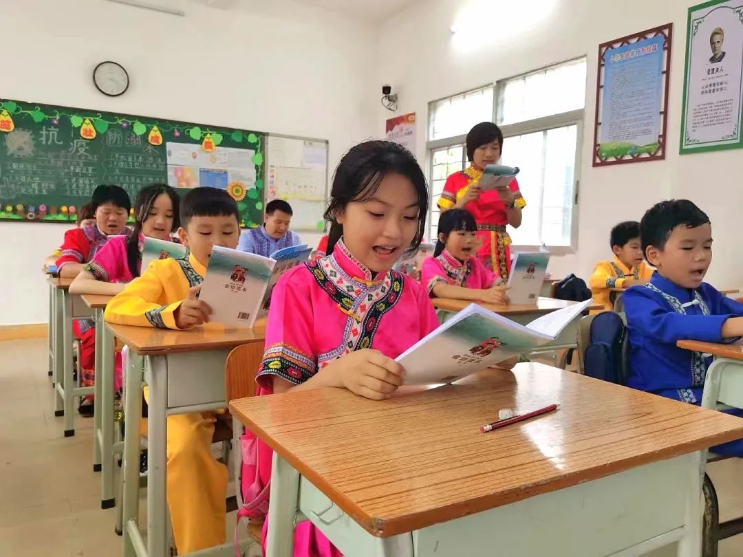 為保護(hù)畬語,在縣委縣政府的指導(dǎo)下,嶂背村從娃娃抓起,在當(dāng)?shù)貙W(xué)校普及畬語課:2012年9月,嶂背小學(xué)招聘畬族老師并成功開設(shè)畬語課程,成為惠州市唯一一個用畬語教材、上畬語課的小學(xué);2015年9月,全國唯一的畬語教材——《畬語課本》第一冊出版,嶂背小學(xué)有了正式的教材;2018年12月,博羅縣教育局與暨南大學(xué)合作出版《廣東博羅畬語800句》;2023年4月,《畬語課本》第一冊即將正式對外發(fā)布……另外,畬語歌曲《感謝共產(chǎn)黨》《敬酒歌》,畬族舞蹈《畬族阿妹喜唱歌》《竹竿舞》《婚嫁舞》等也“走”進(jìn)課堂,豐富了學(xué)生的“第二課堂”,越來越多的畬族孩子學(xué)會并記住自己的民族語言。
