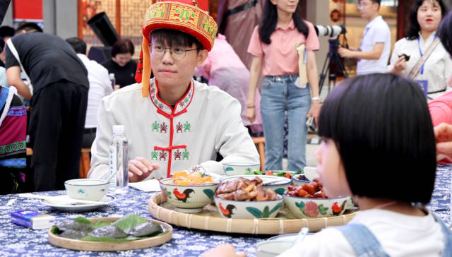 隨后,極具畬族特色的長(zhǎng)桌宴和篝火晚會(huì)精彩上演。在長(zhǎng)桌宴上,烏米飯、糍粑等畬族特色小吃別有一番風(fēng)味,讓賓客體驗(yàn)滿滿的畬式祝福。一堆熊熊燃燒的篝火,點(diǎn)燃畬族小學(xué)的夜景,也將畬族文化節(jié)的氣氛推向高潮。