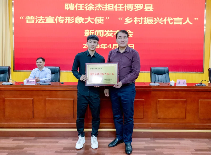 徐杰受聘擔(dān)任博羅縣“普法宣傳形象大使”“鄉(xiāng)村振興代言人”。 惠州日報記者盧泓宇 攝