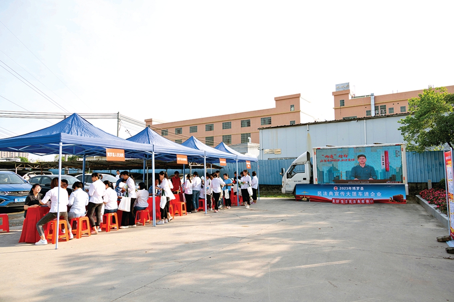 根據(jù)企業(yè)需求,博羅法院定制并派出“服務單”。今年5月是民法典宣傳月,期間這一做法收到良好效果。用大篷車“典”亮依法營商路,是博羅法院與司法、檢察以及環(huán)保部門聯(lián)合推出的企業(yè)普法專項之一。此次普法專項抓住企業(yè)和企業(yè)員工的關注點,通過法治宣傳“大篷車”+現(xiàn)場法律服務的方式開展:“大篷車”循環(huán)播放相關視頻,現(xiàn)場設置法律咨詢臺、擺放主題展板,供企業(yè)員工“流動式”、自助式參觀學習;法院干警為企業(yè)員工宣講企業(yè)經(jīng)營活動常用法律知識,解答涉企或涉職工切身利益法律咨詢,以高效、便捷、暖心的司法服務護航企業(yè)發(fā)展。