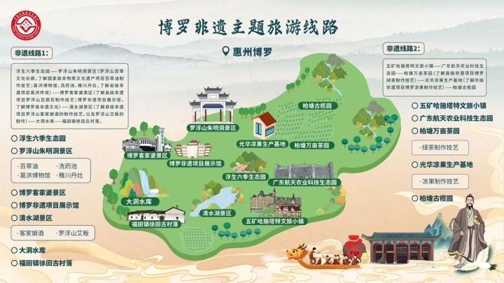 博羅首批非遺主題旅游線路串聯(lián)羅浮山百草油制作技藝、葛洪傳說、博羅涼果制作技藝、羅浮山豆腐花制作技藝、羅浮春酒制作技藝、羅浮山艾糍粑(艾粄)制作技藝、柏塘山茶制作技藝等多項(xiàng)非物質(zhì)文化遺產(chǎn)項(xiàng)目,融入羅浮山風(fēng)景名勝區(qū)、五礦哈施塔特文旅小鎮(zhèn)、浮生六季生態(tài)園等優(yōu)質(zhì)文旅景區(qū),為市民游客提供可看、可賞、可玩、可感知、可體驗(yàn)的豐富非遺旅游享受。