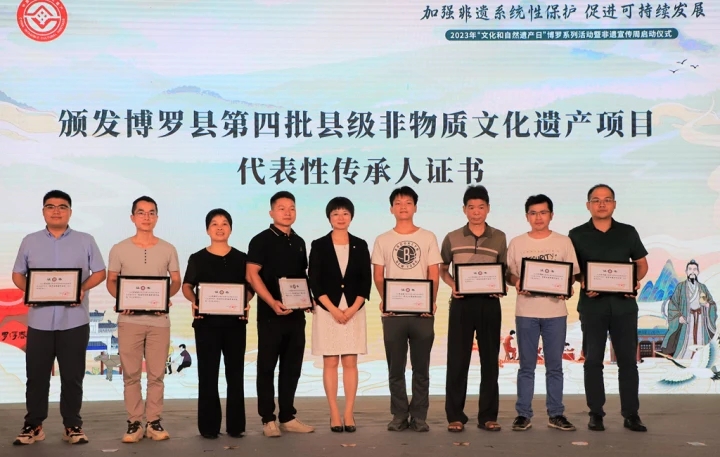 現(xiàn)場還舉行了博羅縣非物質(zhì)文化遺產(chǎn)代表性項(xiàng)目頒牌及傳承人證書頒發(fā)活動(dòng),進(jìn)一步鼓勵(lì)和支持博羅縣非物質(zhì)文化遺產(chǎn)項(xiàng)目代表性傳承人開展傳習(xí)活動(dòng)。葛洪傳說、中醫(yī)傳統(tǒng)制劑方法(羅浮山風(fēng)濕膏藥制作技藝)項(xiàng)目接受廣東省第八批省級(jí)非物質(zhì)文化遺產(chǎn)代表性項(xiàng)目牌匾,李曉聰(博羅涼果制作技藝)等16人接受博羅縣第四批非物質(zhì)文化遺產(chǎn)項(xiàng)目代表性傳承人證書。