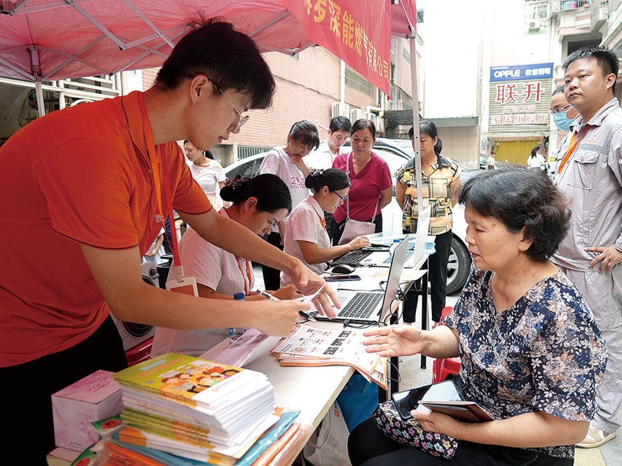 工作人員向居民宣傳老舊小區(qū)報裝的相關(guān)政策。