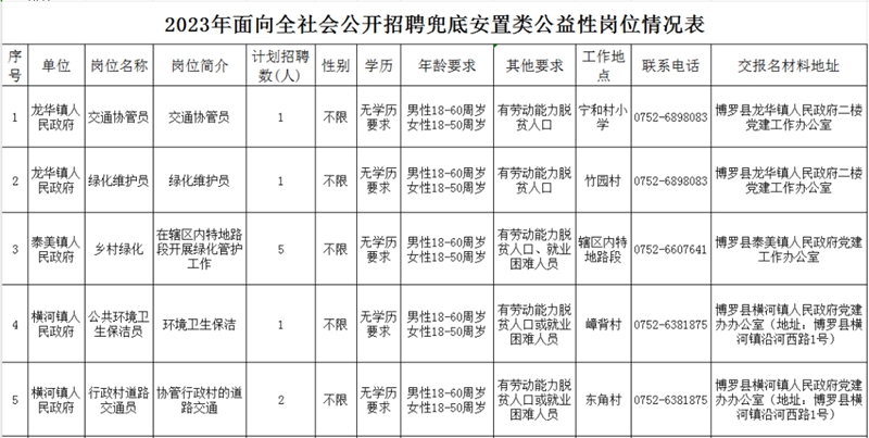 為加強(qiáng)鄉(xiāng)村公共就業(yè)服務(wù)隊(duì)伍建設(shè),夯實(shí)鄉(xiāng)村振興人才支撐,大力推動(dòng)兜底安置類公益性崗位(含鄉(xiāng)村公益性崗位)開(kāi)發(fā),根據(jù)《廣東省人力資源和社會(huì)保障廳 廣東省財(cái)政廳關(guān)于修訂印發(fā)<廣東省兜底安置類公益性崗位開(kāi)發(fā)管理辦法>的通知》(粵人社規(guī)〔2020〕13號(hào))和市人社局《關(guān)于做好惠州市2023年兜底安置類公益性崗位開(kāi)發(fā)工作的通知》(惠市人社函〔2023〕144號(hào))文件要求,結(jié)合博羅縣工作實(shí)際,現(xiàn)將公益性崗位公開(kāi)招聘有關(guān)事項(xiàng)公告如下: