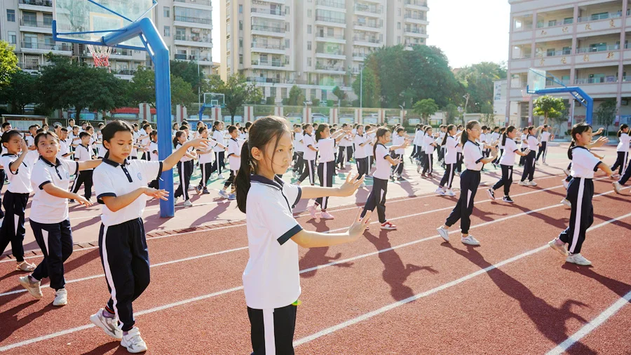 “少兒粵韻操,現(xiàn)在開始!”隨著校園廣播的響起,園洲中心小學(xué)的孩子們在操場上排列整齊,隨著音樂的韻律舞動起來。