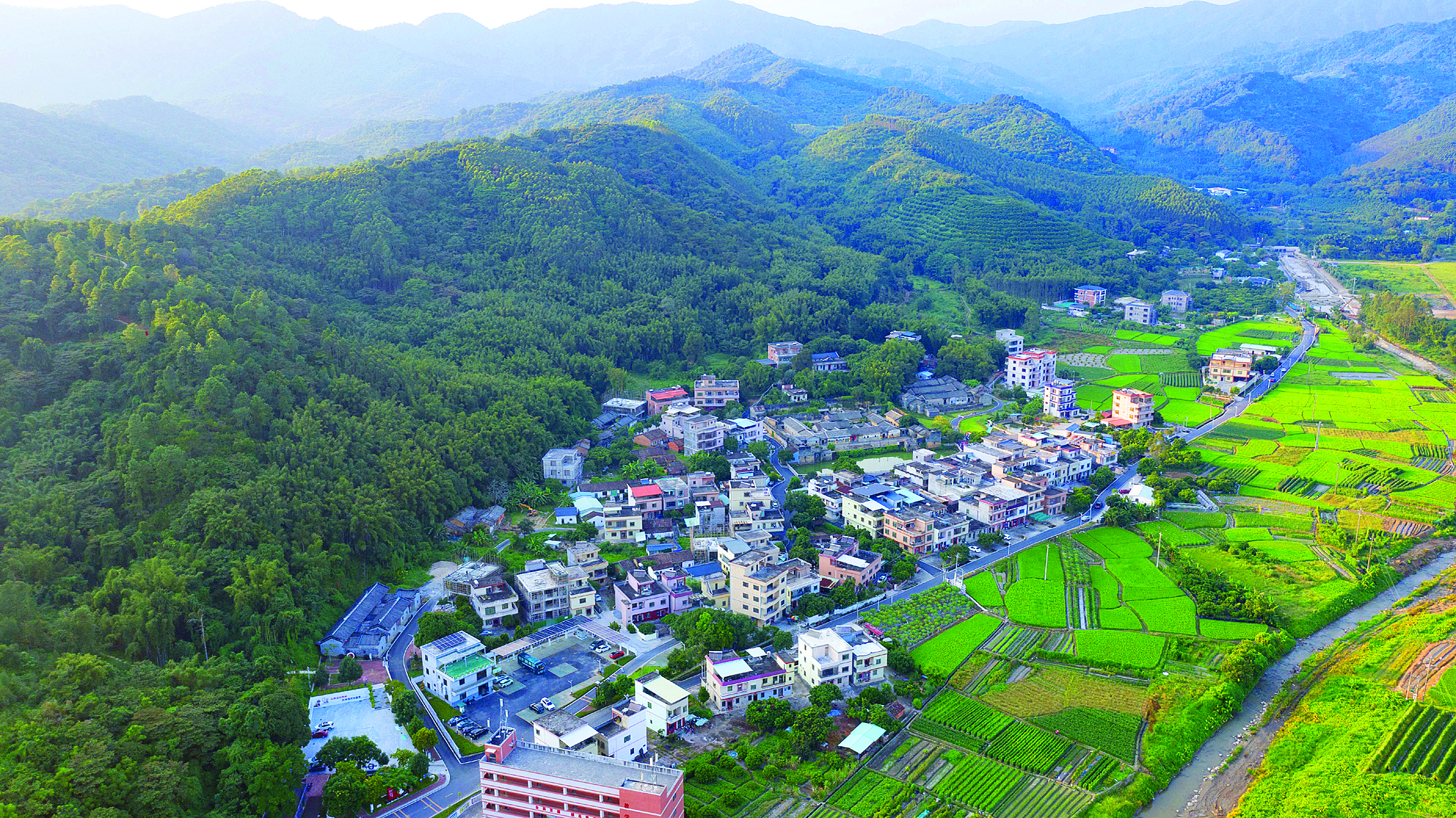 從口袋公園驅(qū)車十分鐘左右,可見一座座頗具現(xiàn)代特色的民宿樓房掩映在綠樹間,與不遠(yuǎn)處的羅浮山勾勒出一幅詩意盎然的山水畫卷。