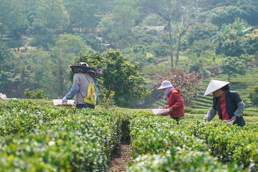 茶農(nóng)在茶園采摘茶葉。